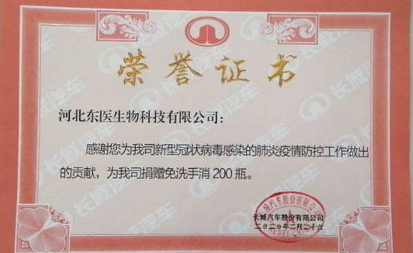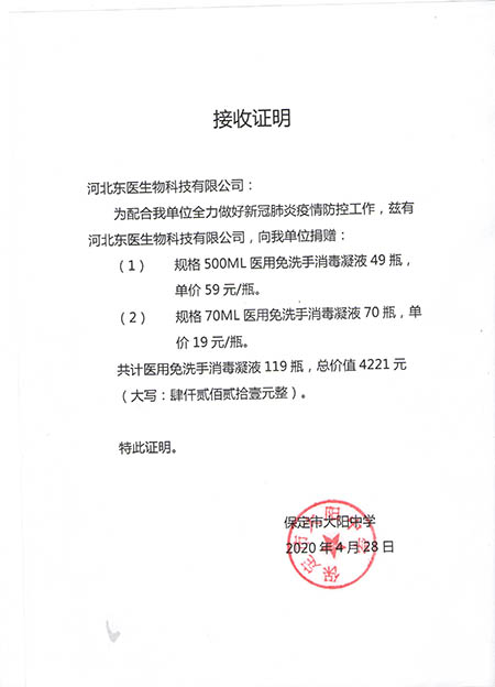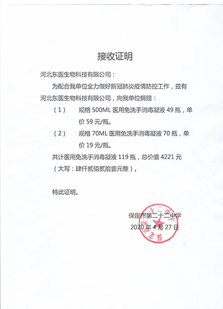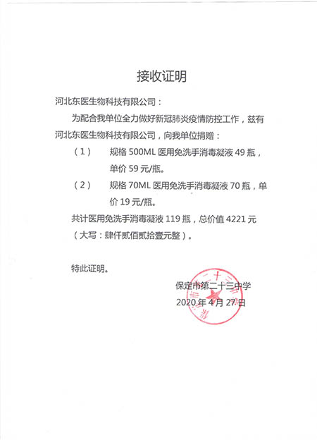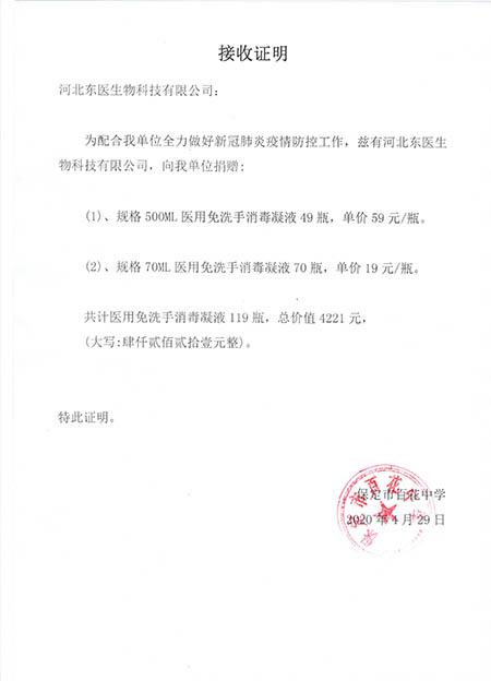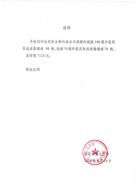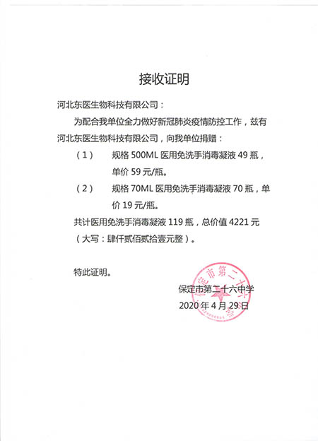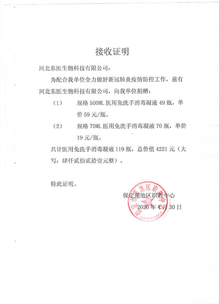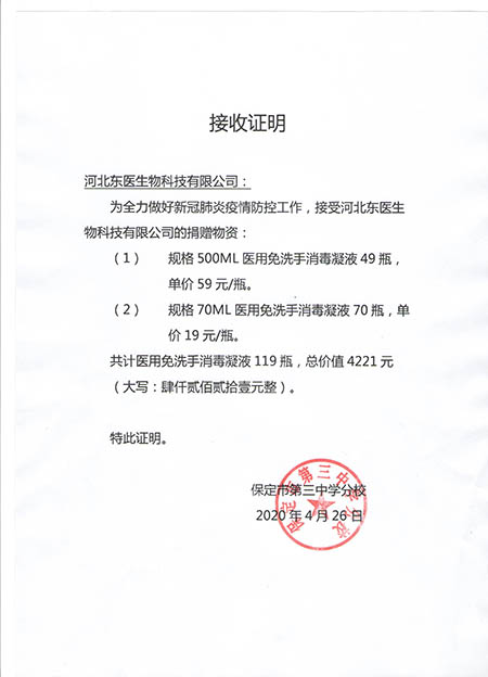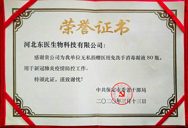 在本次新冠肺炎疫情期间,作为河北省工信厅(第四批)疫情防控重点保障物资生产企业 国产黄A片三級三級三級,保定市应对新型冠状病毒感染的肺炎疫情工作领导小组物资保障组,保定市发改委疫情防控重点保障物资生产企业,保定市政府消杀用品定点采购单位――东医生物积极捐赠消杀防疫物资,为以下系统及单位进行捐赠: 1,保定市区及22个县学校教育系统, 2,保定市第五医院,望都红十字会等卫生医疗系统, 3,保定火车站,客运中心等交通运输系统, 4,保定市科技局,交通局,卫健委等政府机关及数十家企事业单位, 累计捐赠免洗手消毒凝胶市场价值总计200余万元。
